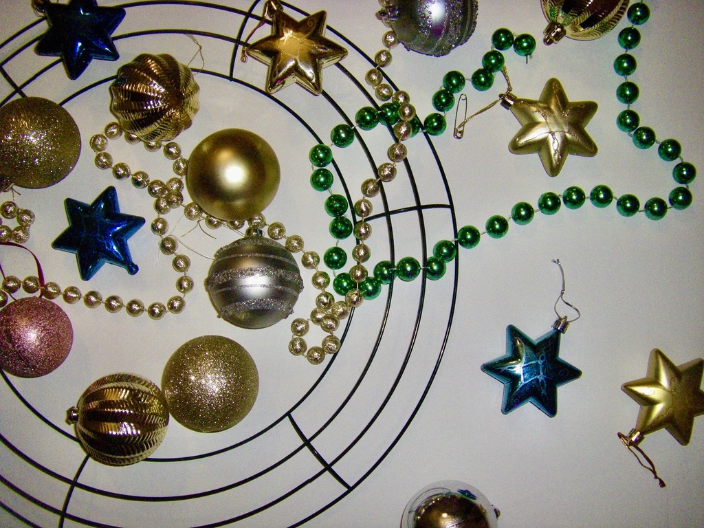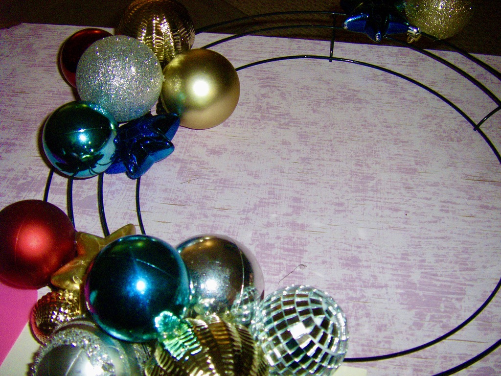 Play around with the colors and textures of the ornaments and start gluing them onto the wire wreath form. Nonetheless, you will also have to dab the ornaments beside them with glue.
