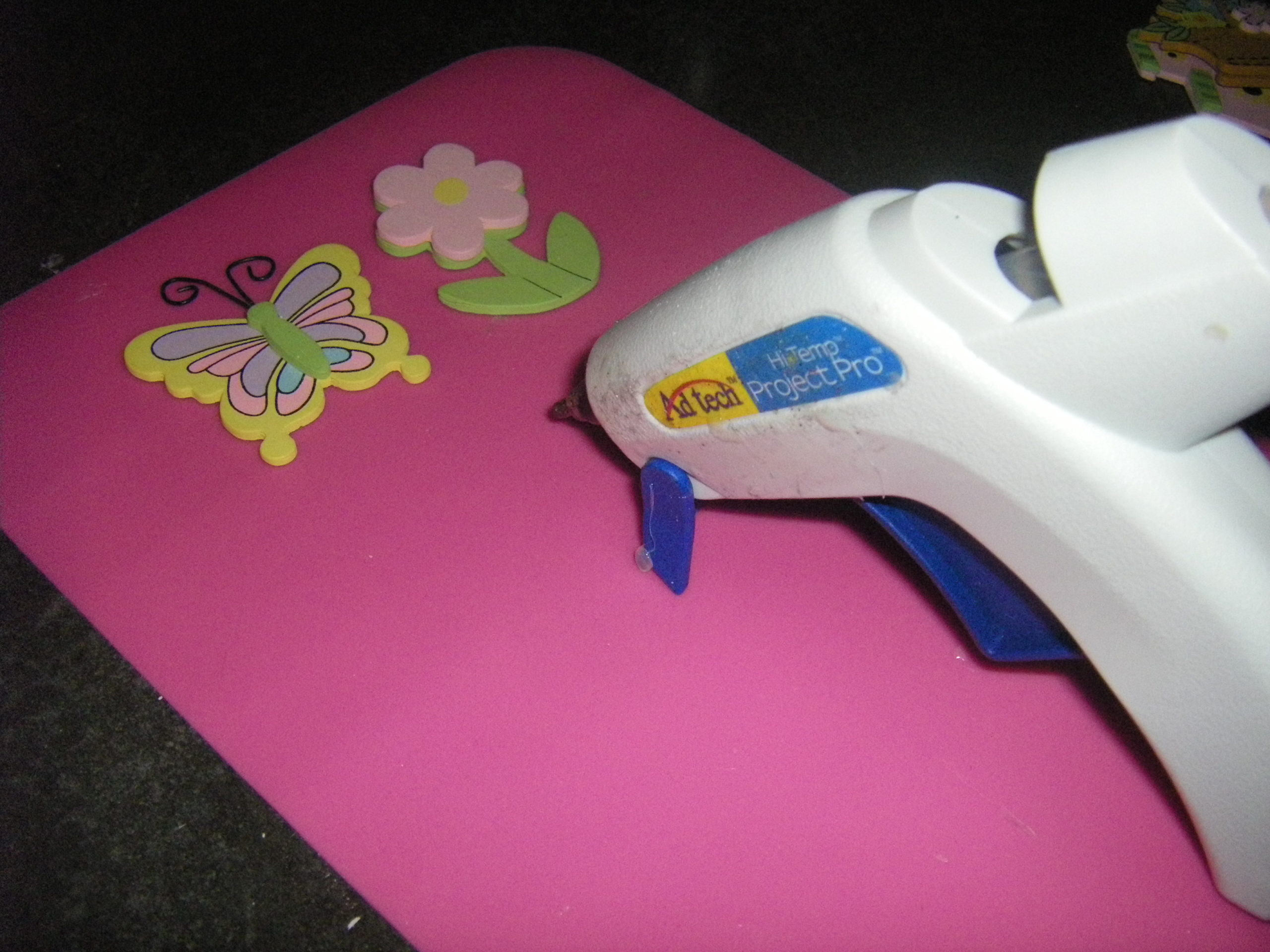 Once completed painting the frame take out your glue gun and attach your craft adornments to your frame. This a perfect time to search for items in your craft stash or get creative. I had these woodcraft items and felt they went well with the color and theme of the picture frame. This gift idea was going to a young girl who loves pink!