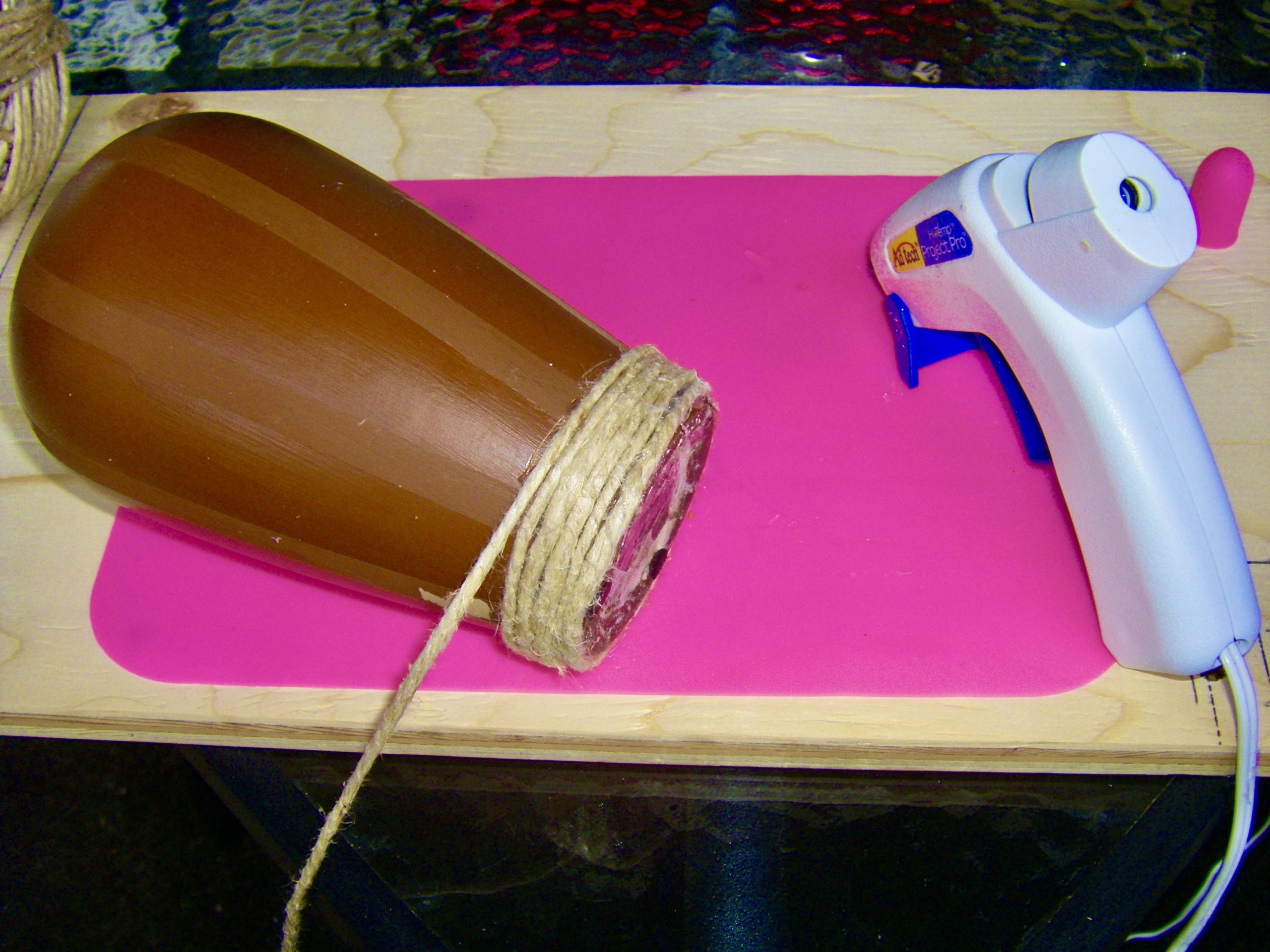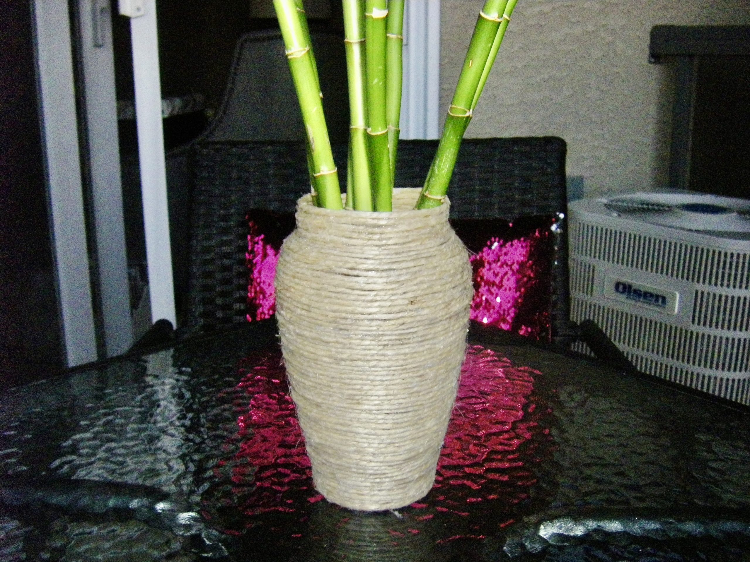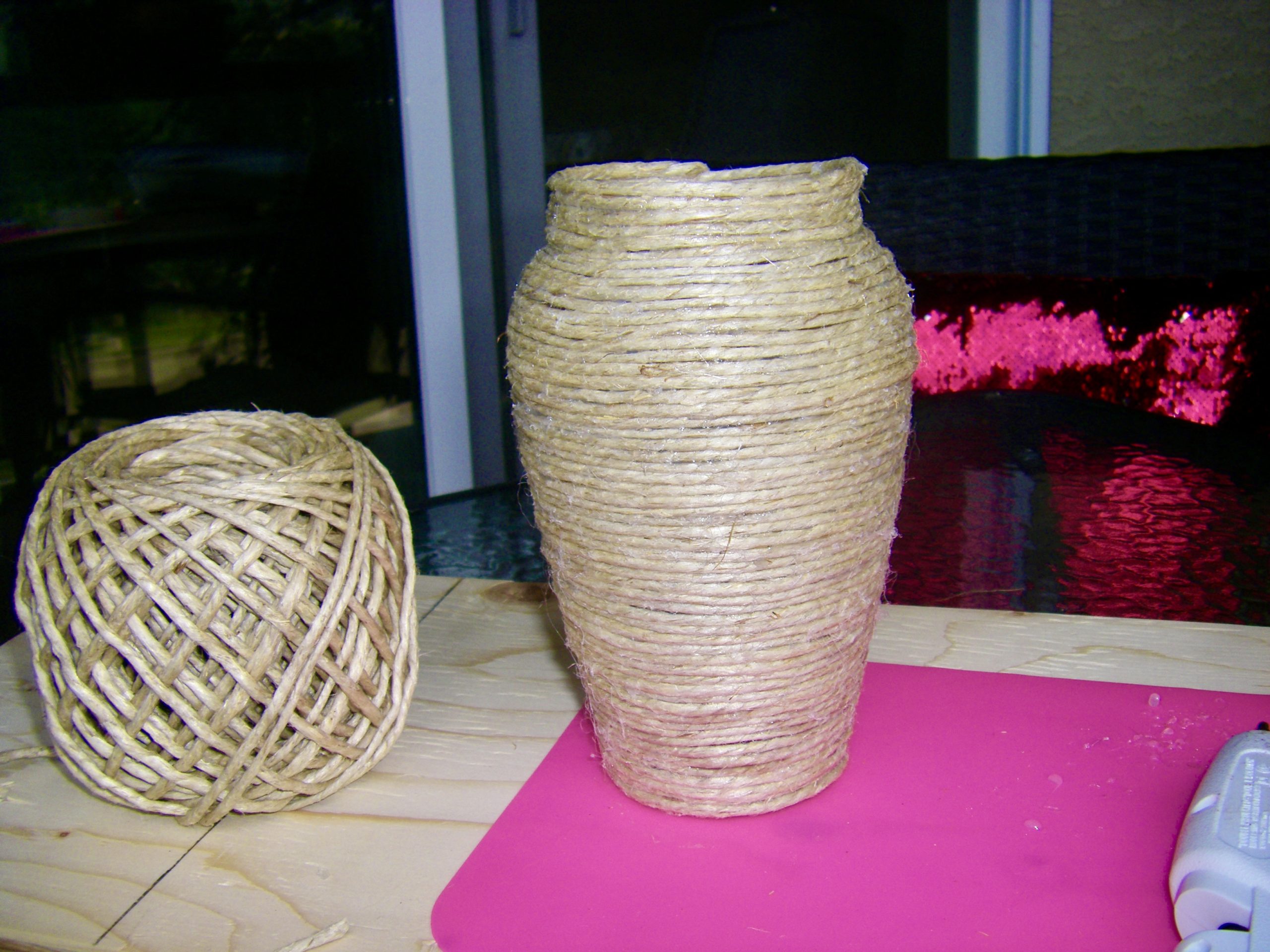 This project is very easy it just takes time to keep circulating the twine on the vase with dabs of hot glue.