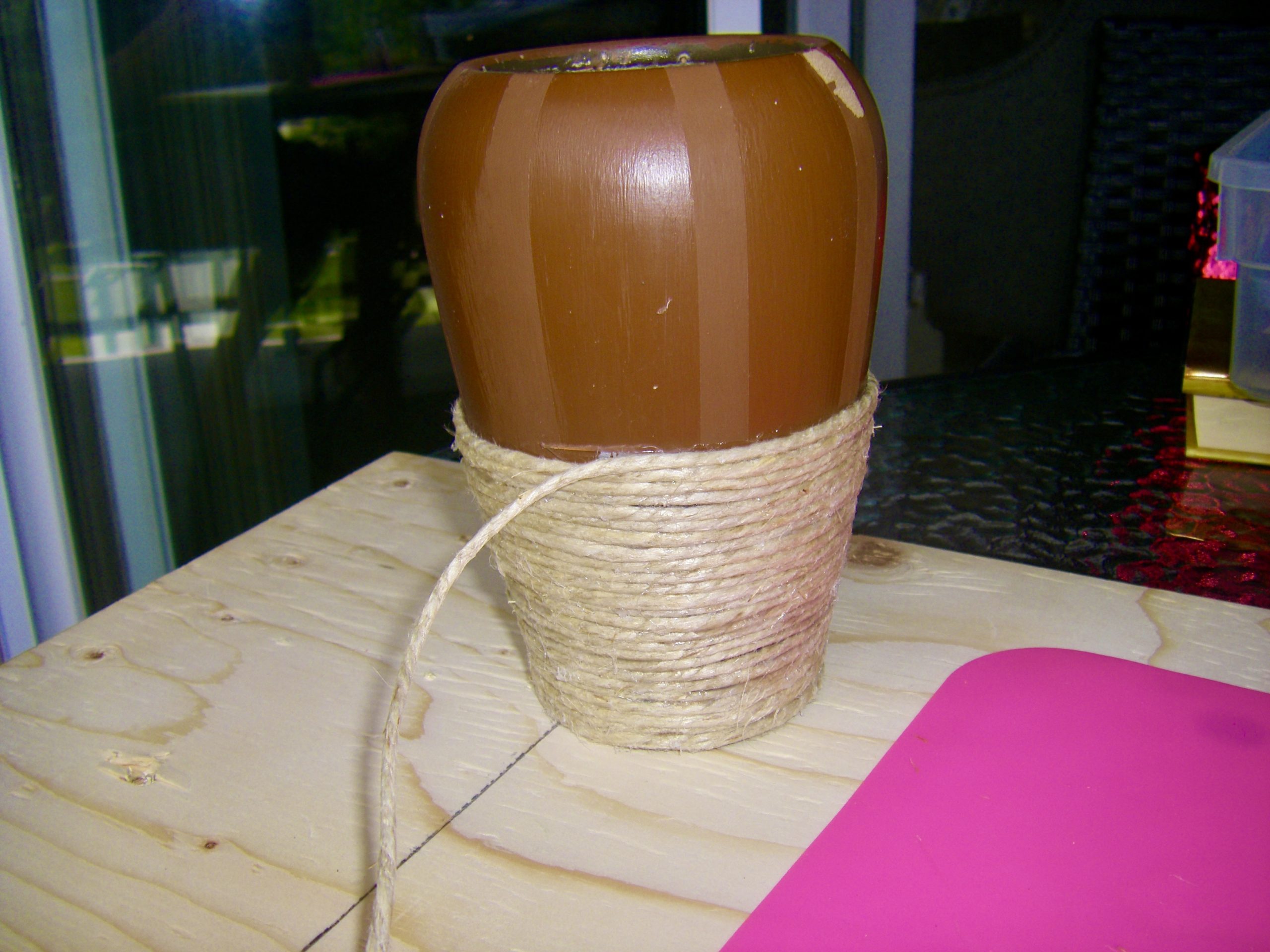 Furthermore, keep attaching the sisal twine to the vase as per the photos.