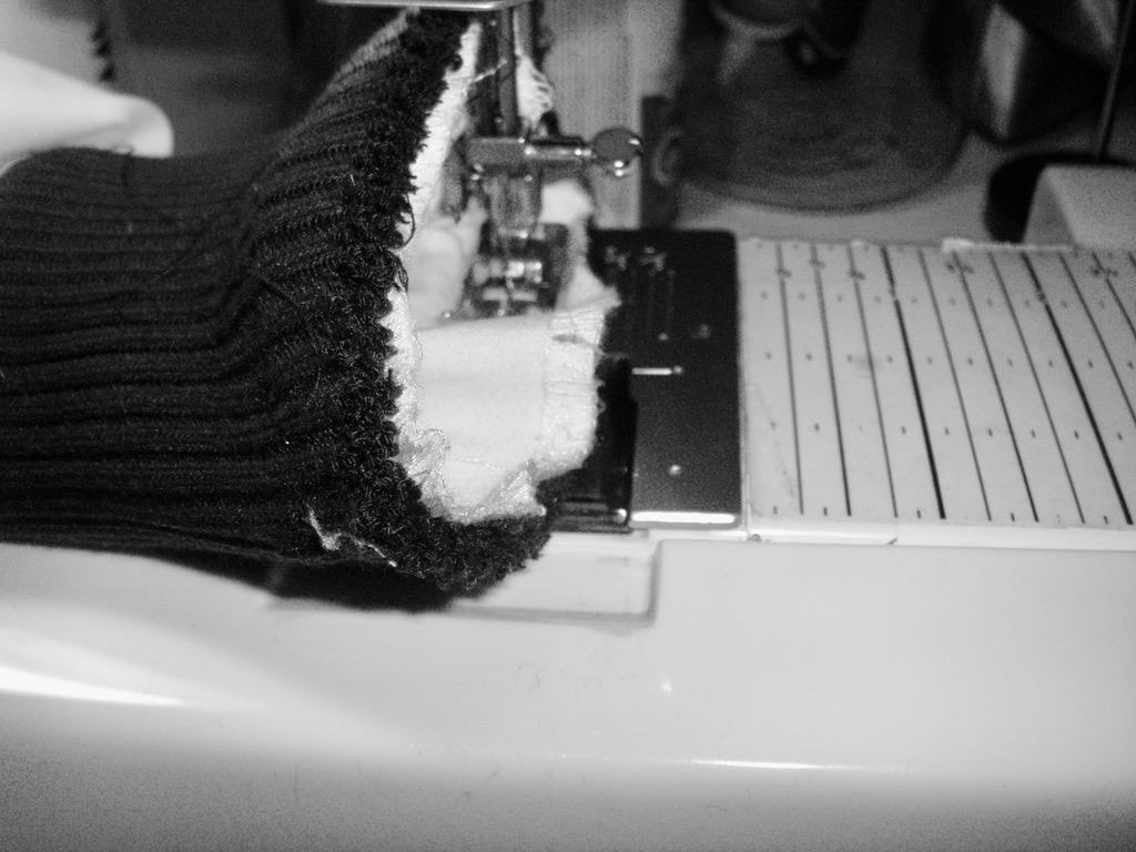 Furthermore, pin the stretched ribbing and stitch around the circumference of the sleeve. Stretching the ribbing so you get a smooth seam.